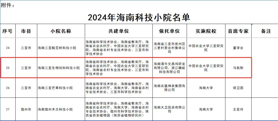 2023年,由海南省科协联合教育厅、农业农村厅印发《中国农村专业技术协会(海南)科技小院建设方案》,明确围绕热带经济作物、水产养殖、畜禽养殖等产业,每年新建一批科技小院。科技小院是一种将科技创新、人才培养、技术服务有机结合的科技服务平台。依托浙江糖能科技有限公司和海南潭牛文昌鸡研发有限公司,中国农业大学三亚研究院实施的“海南三亚生物饲料科技小院”成功获得海南省科协等部门的批复。
